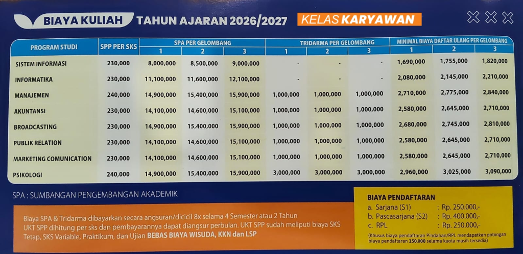 - SPA (Gelombang 1): Rp 8.000.000 (bisa dicicil 8x selama 4 semester)